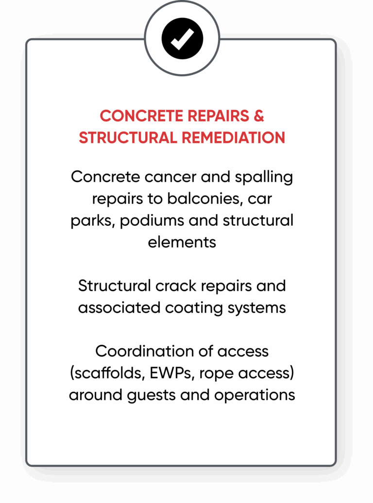 Hospitality and transient living projects can range from targeted leak repairs in a single wing to large façade, concrete and waterproofing programs across an entire site. We don’t quote from guesswork — we build proposals around your asset, scope and operational constraints.