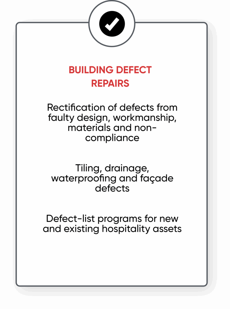 We’re ISO certified for Environment, Quality and OH&S and specialise in remedial works on complex, inhabited buildings — making us a strong fit for hospitality and transient living assets where guest experience and safety are paramount